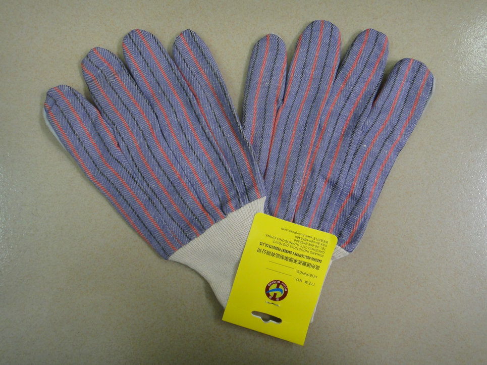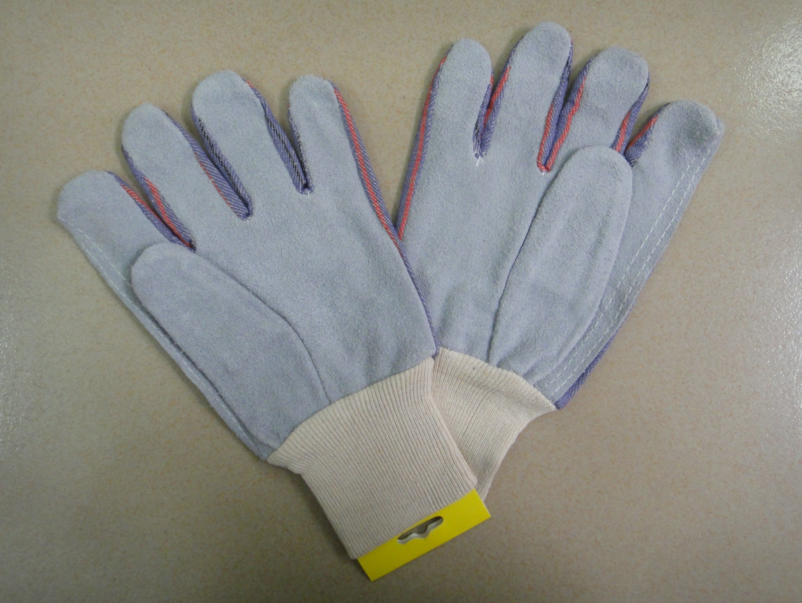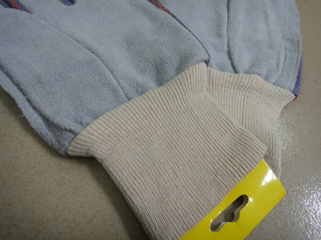 10.5"Natural cowhide split leather work glove,88 style,straight thumb,blue/black/red stripe fabric back,white knitted wrist,palm lined. Quality standard available:A/B grade,B/C grade.