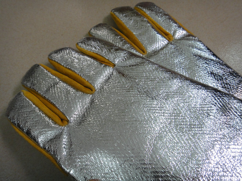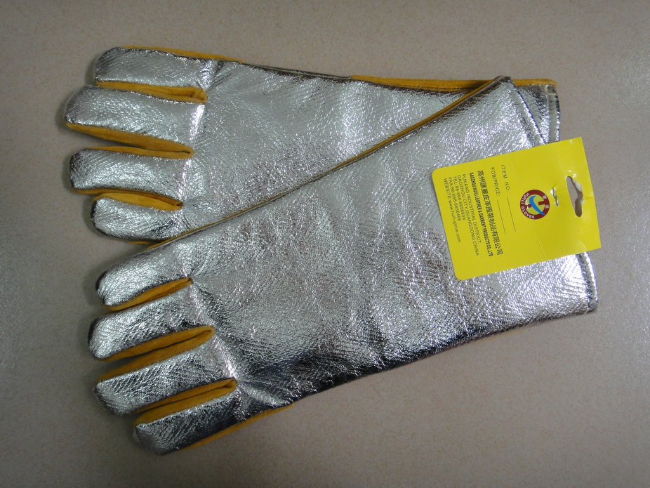 產(chǎn)品描述:14"yellow cowhide split leather welding glove,silver high temperature resistance material on back and thumb,wing thumb,with full-sock jersey lining,welted seam,self leather binding,KEVLAR thread stitching. Quality standard available:A grade,A/B grade