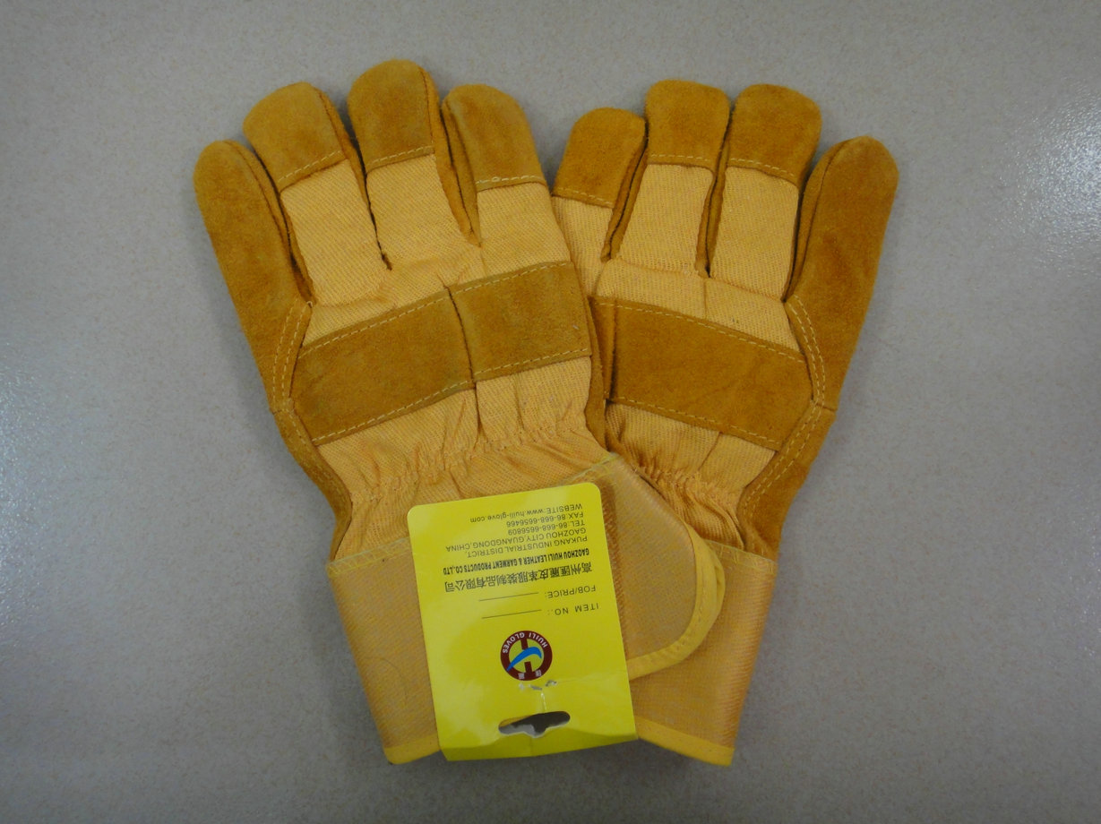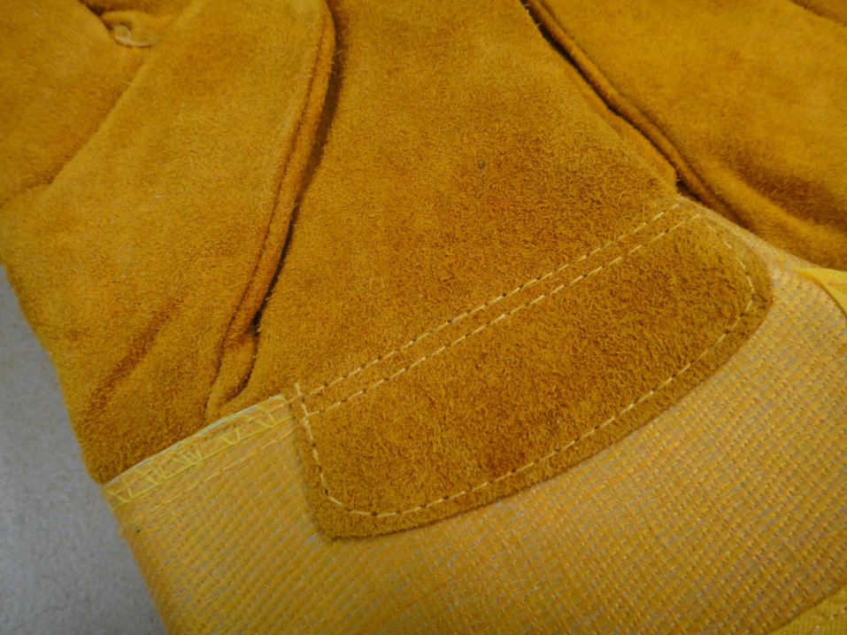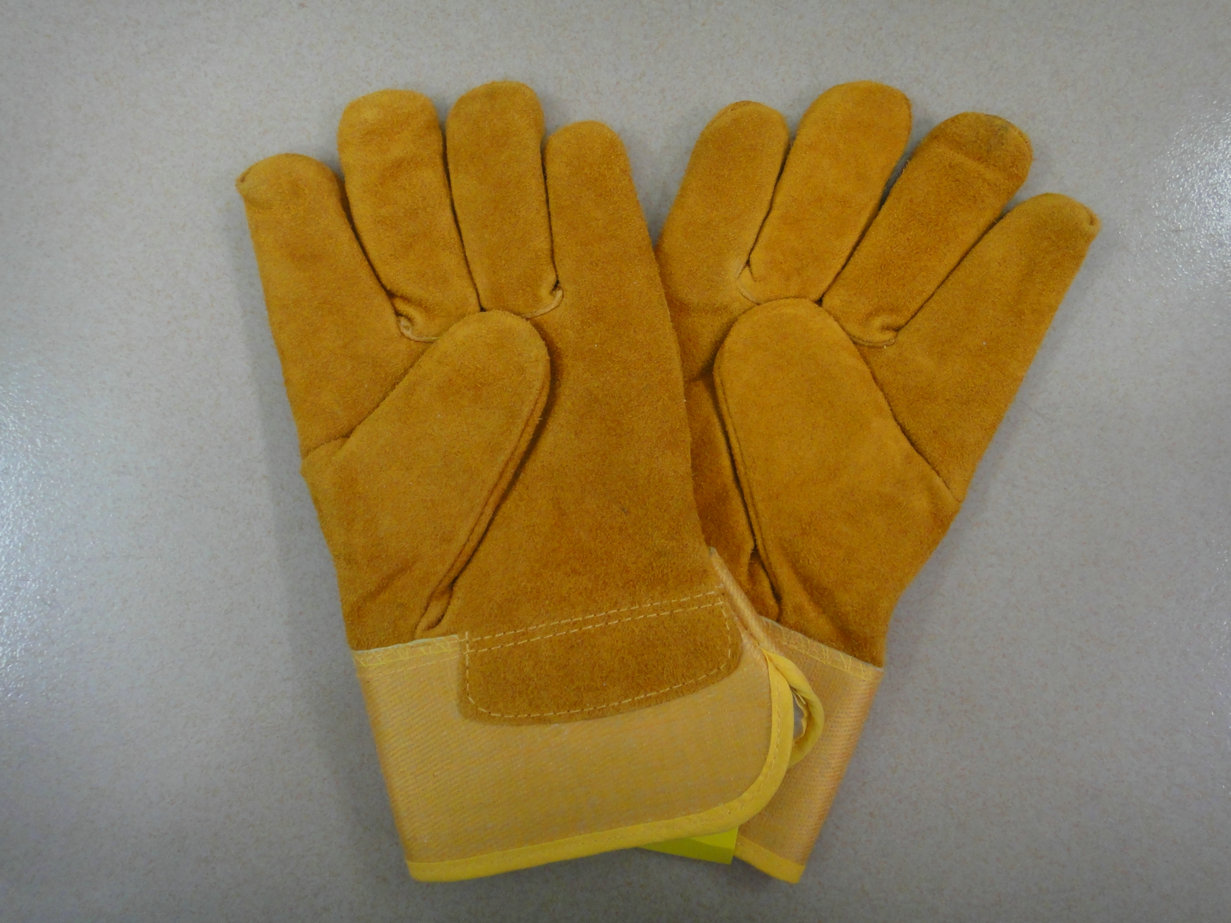 11寸金黃色牛二層皮工作手套,全掌款,黃斜背布和膠袖,車海富里全封里,拉黃邊。