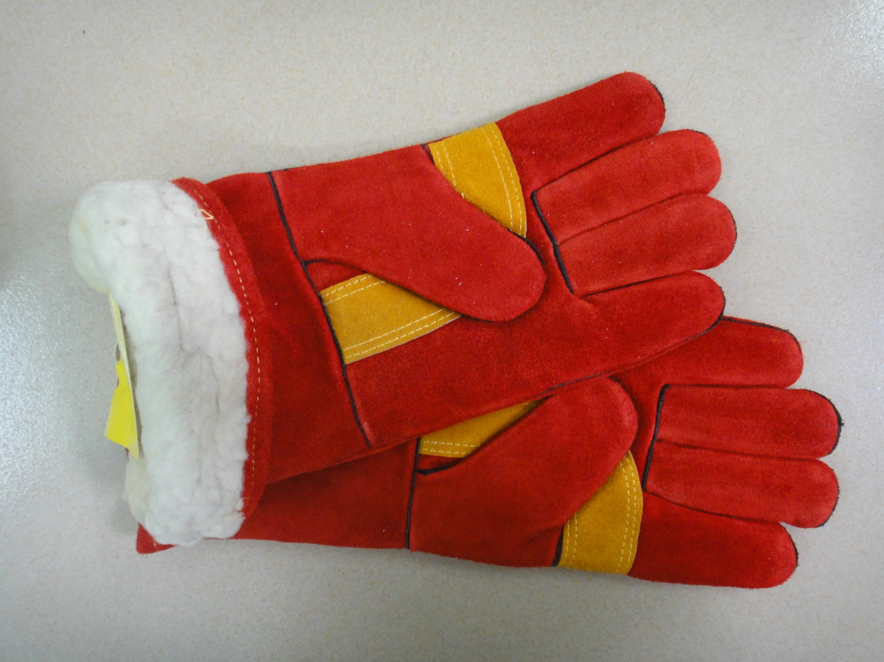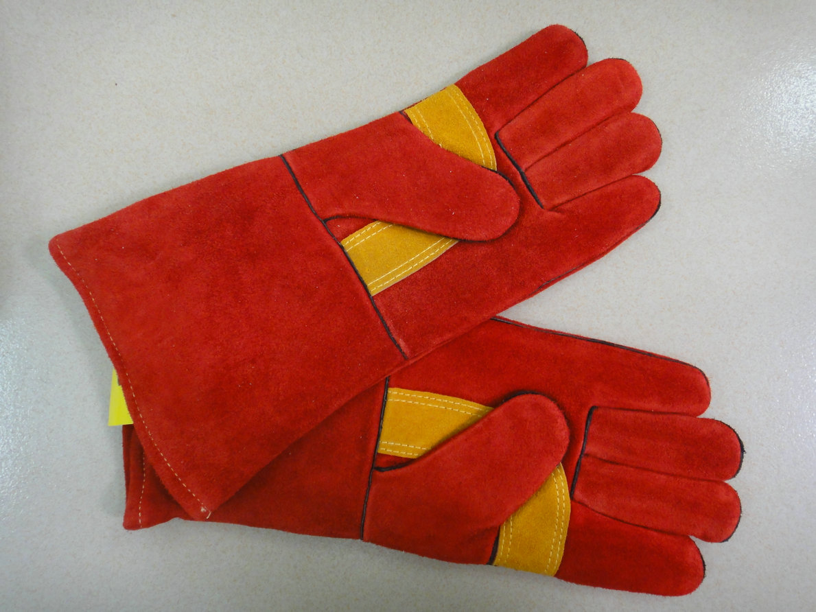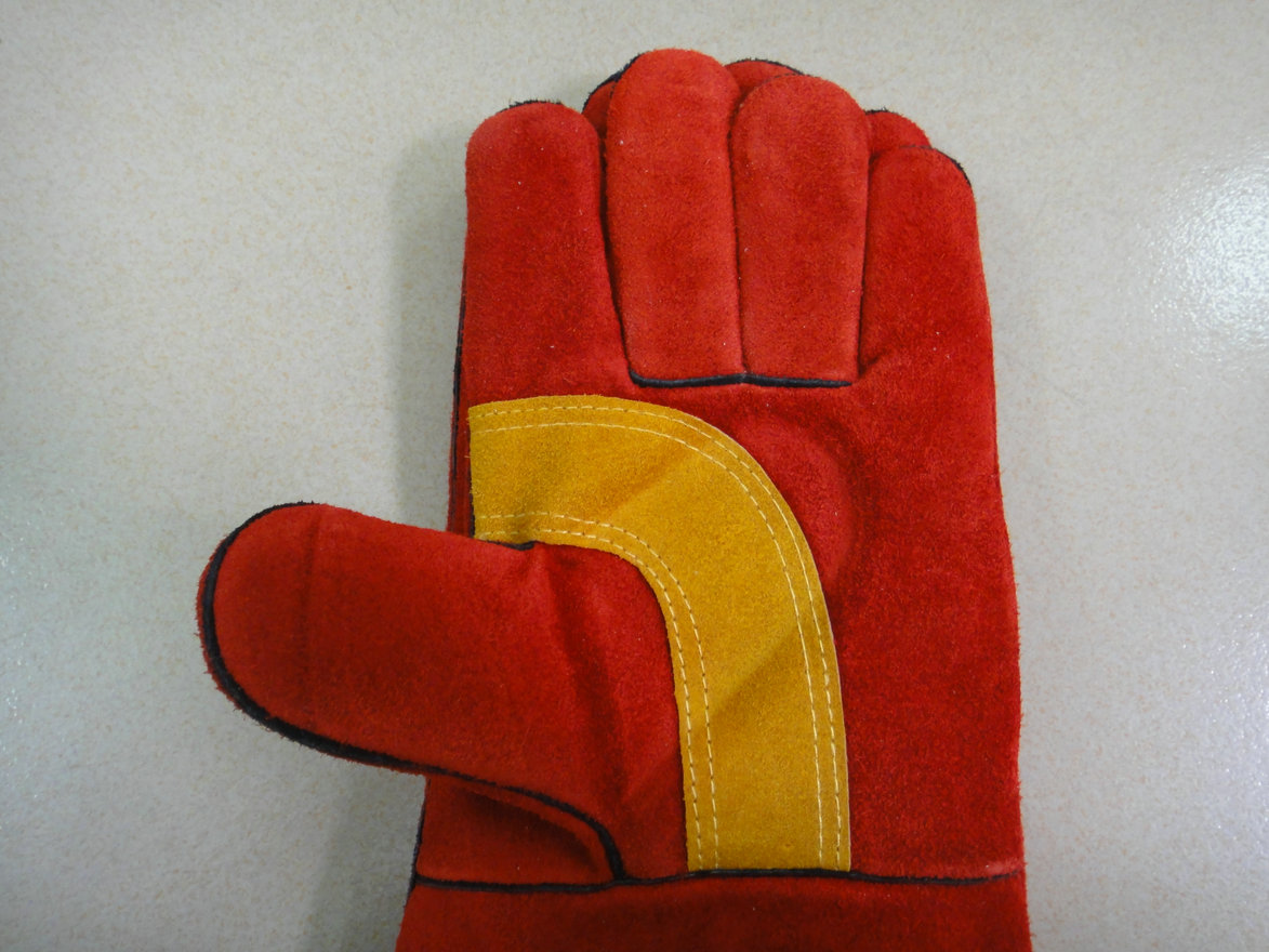 紅色牛二層皮電焊手套,一片皮背,手掌加金黃色月亮彎傍條托,海富里全封里,回邊。