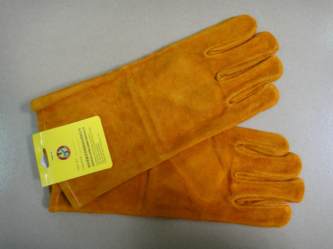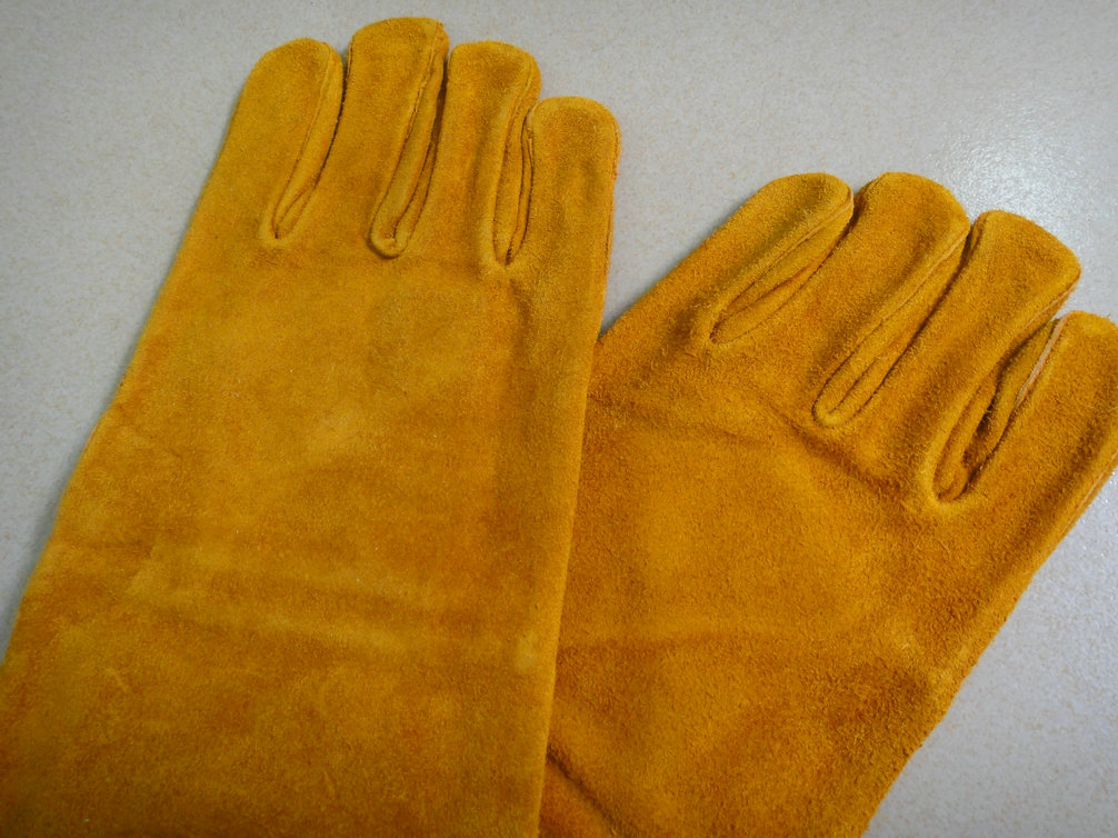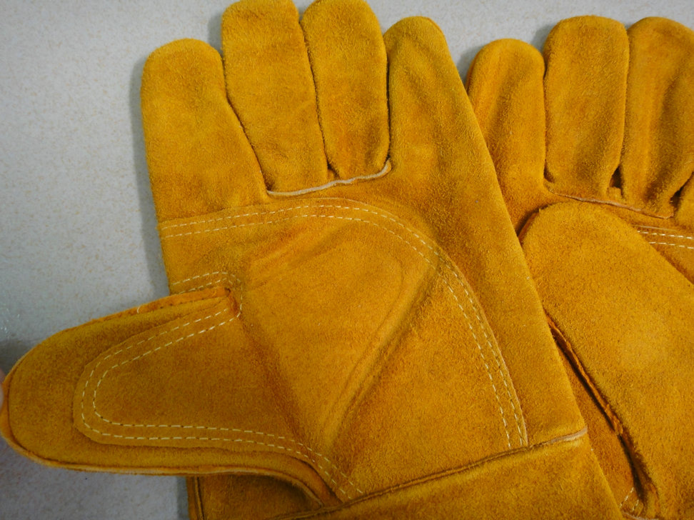棕色牛二層皮電焊手套,全掌款,手掌加3/4棕色牛二層托連拇指,一片背,白斜袖布+雜絨掛里,皮回邊。